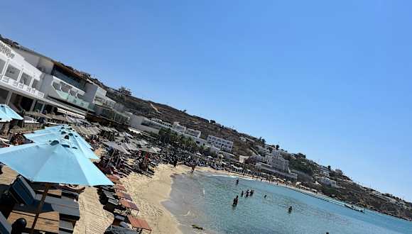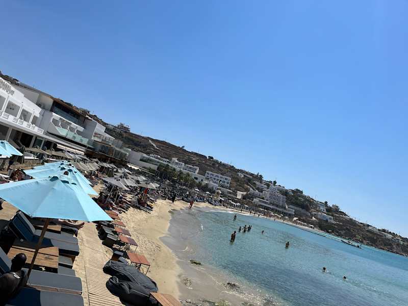Super Liegen und toller Stand in der Nachsaison aber sehr teuer. Luxusstrand von Mykonos.