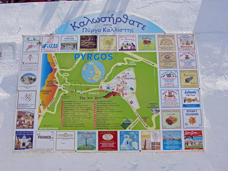 Pyrgos muß man ganz einfach gesehen haben, besonders neben den Sehenswürdigkeiten zu empfehlen ist der kleine Laden unterhalb der Katedrale, mit den typischen Produkten der Insel. Hier wurden wir von den schönsten Souvenirs (Samen von Kapern, Tomatenmark von den Tomaten der Insel) fündig. ein Muß !!