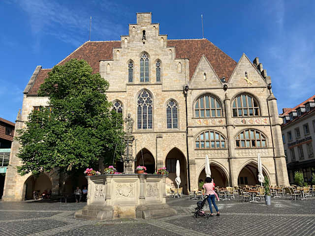 Wie eine Filmkulisse mutet es einen an, wenn man von der Treppe des Rathauses auf den historischen Marktplatz blickt. Kein Wunder, dass dieser Hintergrund des Standesamtes für Trauungen benutzt wird. Das Rathaus von Hildesheim mit dem charakteristischen Treppengiebel zwischen Irisplatz und Marktplatz wurde im 13. Jahrhundert errichtet. Im Jahre 1268 begonnen ist es im Laufe der Zeit oft verändert worden. Seine Umgebung wurde erst relativ spät zum Handels- und Lebenszentrum von Hildesheim. Sein heutiges Aussehen bekam es bei seinem Wiederaufbau in den Jahren 1950 bis 1954. Anstelle des ehemaligen barocken Uhrturmes ertönt nun mehrmals am Tage das am Rathaus angebrachte Glockenspiel. In der Spitze des Giebels verbirgt sich ein kupferner Trompeter, der um 12:00 Uhr seine Fanfare ertönen lässt. Hinter den Arkadenbögen geht es in den Ratskeller (Restaurant König von Bayern) hinunter und die rechte Frontseite zieren Wappen der Stadt. Das „Garnmaß“ an der linken Seite des Rathauses erinnert an das Wirken und Handel der Kaufleute im Mittelalter. Über die Baugeschichte des Rathauses und die der benachbarten Bauten informieren Metallreliefs unter den Arkaden. Sie enthalten auch Erläuterungen in Blindenschrift.