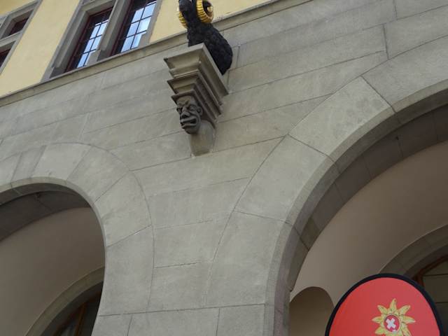 Die Tourist-Information befindet sich in der ehemaligen Kornhalle des historischen Rathauses aus dem 15. Jahrhundert. An der Fassade des Gebäudes kann man eine gotische Halbfigur eines Widders (Wappentier von Schaffhausen) entdecken. In der Tourist-Information wurde uns sehr freundlich weiter geholfen.