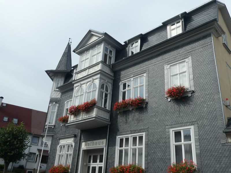 Das neue Rathaus von Friedrichroda befindet sich in der Gartenstraße 9, nur ca. 150 bis 400 Meter von der Marktstraße entfernt (je nachdem, wo man sich in der Marktstraße befindet). Es ist ein recht schönes Gebäude, das nach meiner Meinung unbedingt einen Besuch wert ist. Von der Marktstraße aus erreicht man das Rathaus über die Lindenstraße, dem Kreisverkehr und kommt so in die Gartenstraße. Es ist ein schönes, mit Schieferschindeln verkleidetes Gebäude (mit mehreren Erkern). Dieses Haus wurde 1903 als „Hotel National“ erbaut. Das alte Rathaus, das in der Hauptstraße (am heutigen Alten Rathausplatz) stand, fiel 1904 einem Feuer zum Opfer. Übergangsweise wurde das Stadthaus in der Hauptstraße als Ersatz für das Alte Rathaus genutzt (während nach einem neuen Standort für ein neues Rathaus gesucht wurde). Dieses Stadthaus befand sich in unmittelbarer Nähe zum Alten Rathaus. Aber auch dieses Stadthaus wurde 1922 das Opfer eines Feuers. So wurde noch im Jahr 1922 das „Hotel National“ als neues Ausweichquartier gekauft (durch die Inflationswirren konnte das inzwischen leerstehende Hotel für 2.000.000 „Inflations-Mark“ recht günstig gekauft werden). Damit wurde ein Rathaus-Neubau überflüssig und noch heute befindet sich das Rathaus im einstigen „Hotel National“