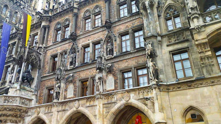 In München am Marienplatz befindet u,a, das Neue Rathaus. Dieses prächtige, beeindruckende Gebäude wurde zwischen 1867 und 1909 in drei Bauabschnitten errichtet. Vom Marienplatz aus hat man einen tollen Blick auf die fast 100 Meter lange, reich verzierte Rathaus-Südfassade und auf den ca. 85 Meter hohen Rathausturm vom Neuen Rathaus. An diesem Rathausturm findet täglich das Glockenspiel mit dem Schäfflertanz statt (täglich um 11:00 und 12:00, von März bis Oktober zusätzlich um 17:00 – Stand Juli 2022, Änderungen möglich). Auf dem Rathausturm befindet sich zudem eine Aussichtsgalerie, die mit einem Aufzug erreicht werden kann. Von dieser Aussichtsgalerie hat man eine tolle Aussicht auf München und über München hinweg – bei guter Sicht kann man bis zu den Alpen blicken. Auf dem Rathausbalkon zeigen sich (inzwischen fast jährlich) die Spieler und Verantwortlichen vom FC Bayern München zur Meisterschaftsfeier (oder zu einem Pokalsieg auf nationaler oder internationaler Ebene). Besonders schön ist der Blick zum Neuen Rathaus, wenn man am Marienplatz etwas zurück Richtung der Häuserfront geht, die dem Neuen Rathaus gegenüber liegt und man dabei die Mariensäule zwischen sich und dem Neuen Rathaus bringt. ACHTUNG - NICHT VERWECHSELN: Im Osten vom Marienplatz befindet sich auch das Alte Rathaus.