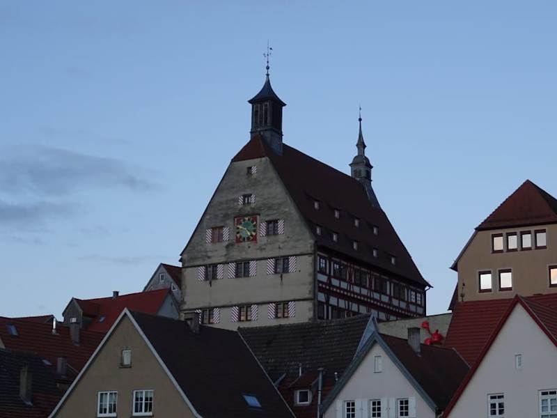 Das schöne Rathaus am Marktplatz in Besigheim wurde im Jahr 1459 erbaut. Zunächst war es ein Kaufhaus, weil im Untergeschoß eine Markthalle war. Im ersten Stock befand sich der Tanzboden, hier wurden alle Festivitäten abgehalten. Im zweiten Stock wurde Gericht gehalten. Bei der Renovierung im Jaht 1977 fand man an den Wänden Malereien und an den Decken Stuck. Diese Kunstwerke wurden wieder restauriert. Heute befindet sich dort das Rathaus.