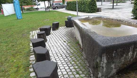 Der Rathausbrunnen steht vor dem Rathaus in der Grünanlage. Es ist ein rechteckiger Brunnen mit einer Inschrift. Vor dem Brunnen ist eine Sitzbank und einzelne Sitzblöcke zum Sitzen. Am Brunnen wurde eine neue Wasser Degustation aufgestellt.