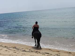 Ich war im Nachbarhotel untergebracht und 2mal zum ausreiten in diesem Stall. Geputzt,gesattelt und getrenst wird selbst.Danach geht es zum auf wärmen (alle 3 Schrittarten) auf den Platz. Wo alleine und Verbandsreiten betrieben wird,erst danach geht es ins Gelände und zwar im Schritt zum Strand,wo dann jeder der möchte alleine im Jagdgalopp am Meer galoppieren darf.Danach geht es im Schritt zurück zum Stall wo jeder sein Pferd selbstversorgt inkl. Abduschen. Die Pferde stehen gut im Futter und die Ausrüstung ist gepflegt.Alles was der Reiter/Reiterin braucht kann umsonst ausgeliehen werden. Mein Tipp: Bianco. Er geht zwar etwas unruhig an der Hand aber die Gänge sind butterweich (Trab kann problemlos ausgesessen werden) Nachteil: Es gibt nur eine Ausrittsroute.