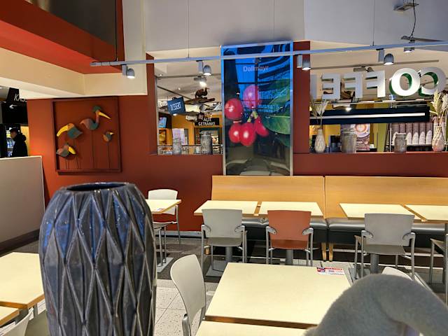 Modern eingerichtet auch ein Hotel gibt es und Starbucks. Die Autobahnraststätte Bruchsal ist angenehm gestaltet und sauber, es gibt schöne bunte Sitzplätze und das Frühstück mit Rührei war gut, auch die heisse Schokolade aus dem Automat war mit viel Milch und schmeckte. Ruhig war es auch noch früh am morgen.