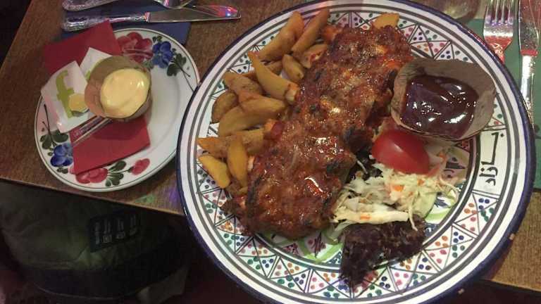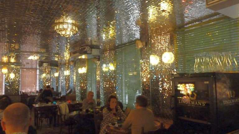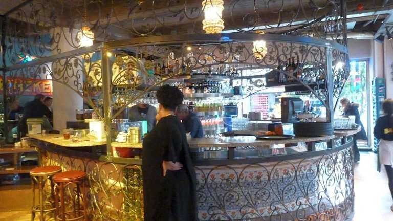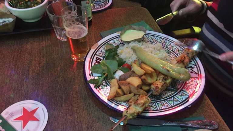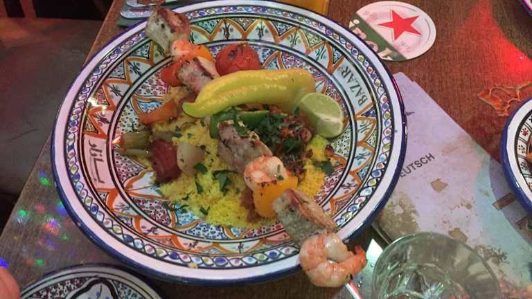 Die bekannteste Restaurant- und Kneipenmeile Rotterdams ist die Witte de Withstraat, und die ist auf jeden Fall einen Abstecher wert. Hier finden sich Restaurants und Kneipen für jeden Gusto und an unserem 2. Abend in Rotterdam entschieden wir uns für dieses Restaurant, das uns am ersten Abend beim Vorbeischlendern durch sein ausgefallenes Ambiente auffiel. Zu fünft kehrten wir hier ein (Reservierung unbedingt erforderlich!). Das Ambiente ist schon ein sehr besonderes. Auf drei Etagen fühlt man sich ein wenig wie im Orient. Die Mitte ist offen nach oben und unten. Hier hängen viele große orientalische Lampen, alle Wände sind mit kleinen Spiegelchen bzw. glitzernder Metallfolie versehen, vor allem in der oberen Etage. Im Parterre ein bisschen Shabby-Look bei den Tischen, uns gefällt es ausgesprochen gut hier. Insgesamt sehr Individuell, manche würden sagen kitschig, aber es hat eine Menge positiven Charme. Das Personal ist mehrsprachig, schnell und kompetent, fröhlich und immer dem Gast zugewandt. Die Menükarten gibt es in sieben oder acht Sprachen, so auch komplett in Deutsch, was die Auswahl und Entscheidung deutlich erleichtert. Angeboten werden Spezialitäten aus Nord-Afrika und dem Nahen Osten, z.B. Falafel, Pita, Fischsuppe, Couscous, Kebap, Taboulé-Salat und vieles mehr. Die Karte ist sehr vielseitig angelegt. Der Service gibt gerne Auskunft bei Gerichten und Zutaten, die wir nicht kennen. Das Essen kommt schnell und wird einhändig auf einem riesigen Tablett herbeigebracht. Die Portionen der einzelnen Mahlzeiten sind sehr groß, ausgesprochen lecker, auch rein optisch eine Augenweide, toll angerichtet auf offenbar handgemachtem Geschirr. Die Preise sind mehr als angemessen. Und alles, wirklich alles ist gut gelungen und hat hervorragend geschmeckt. Die Fleischspieße waren wunderbar zart, toll gewürzt, der Taboulé-Salat mit den vielen Kräutern, vor allem reichlich Petersilie, erfrischend und ausgesprochen lecker! Wer allerdings richtig scharf genießen will, muss etwas nachwürzen. Dieses erste Mal war für uns so toll, dass wir für den nächsten Abend gleich noch einmal reservierten für unsere gesamte Gruppe von neun Leuten. Alle haben sich sehr wohl gefühlt und das Essen genossen! Unbedingt ausprobieren!