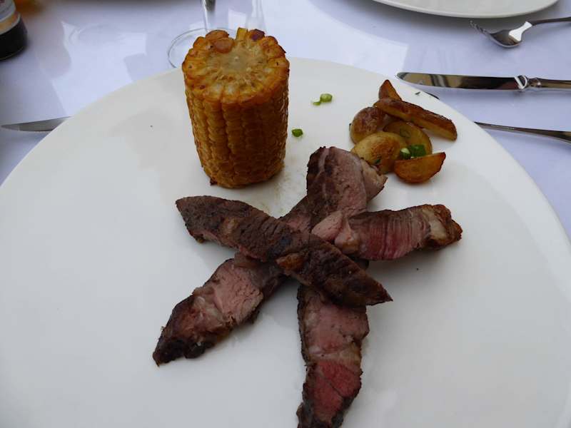 Das dem Hotel Westin Bellevue angeschlossene Restaurant „Canaletto“ ist ansprechend, mit Terasse zum Garten hin gelegen, kann auch vom Elbufer aus erreicht werden, und bietet eine höherpreisige Küche. . Die Inneneinrichtung ist geschmackvoll, teils im Bistro-Stil in einer Vorhalle. Die Terasse, die bei gutem Wetter eingedeckt wird, ist recht gross, zur Garten- / Elbseite hin. Die Speisekarte ist, dem Hotel und der Lage entsprechend, im höherpreisigen Bereich angesiedelt. Offene Weine aus der Region 0,2 l: Weiss 9,50 €, Rot: 11,00 €. Wir selber nahmen allerdings an einem Grill-Abend unser Essen auf der Terasse ein, wobei ein (sehr) kleines, recht übersichtliches Salat-Buffet und wählbare Fleisch-Sorten (Steaks) die ganze Auswahl ausmachte. Wir wählten ein ein Steak „für 2 Personen oder den grossen Appetit“, nämlich ein „US Bavette aus dem Norden Amerikas ab 500 g“ zum Preis von 41,50 €. Wir bekamen dann allerdings ein „Dry Aged Cote de Boeuf ab 500 g“ für 52,00 €. Das Steak wurde für 2 Personen dann am Tisch in Streifen aufgeschnitten, der Knochen ausgelöst, und auf einen (leider kalten) Teller gepackt, so das auch die Rest-Wärme vom Grill nach der Prozedur sich leider fast gänzlich verflüchtet hatte…! Schade. An weiteren Steaks wurden Irische Rind wie auch vom Simmenthaler bzw. Alpenweide-Rind (Roastbeef und Filet) als Einzel-Portionen (zwischen 27,50 € und 36,50 € pro Person) angeboten. Einen „Normal-Abend“ mit a la Carte–Essen kann ich leider nicht beurteilen, das Grill-Experiment war leider etwas dürftig, aber durchaus verbesserungswürdig, das Personal freundlich.
