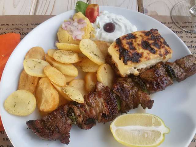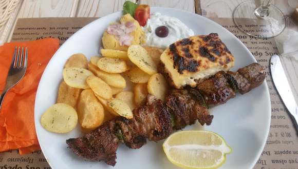 Weil wir vom Regen überrascht wurden wählten wir dieses Lokal dessen Terrasse über den engen Gassen von Fira liegt. Für Brot /Butter (Gedeck) wird 70 cent verrechnet. Eine griechische Vorspeisenplatte um 9,50 reicht für 2 Personen, zum Griechischen Menüteller vom Schwein werden eine Portion Moussaka und gebratenen Kartoffeln mit Tsatziki serviert, Gyros Spezial vom Huhn kommt mit Kartoffeln und Pitabrot als Beilage. Der halbe Liter Hauswein schlägt mit 4,50 zu Buche. Empfehlenswertes Restaurant.