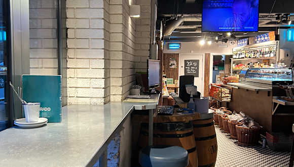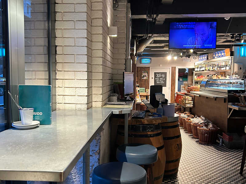 Spanisches Tapa Restaurant Es gibt ein Spezialitätenladen mit spanischen Produkten und eine lange Bartheke. Man sitzt auf Höckern und die Tische sind hoch, etwas unbequem für die hohe Preise. Ich hatte Spießchen und Salat, sehr lecker. Die Jungs sind sehr aufmerksam und super höflich, englische Manieren und spanische Küche