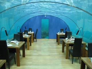 Der einzige Wermutstropfen bei dem Restaurantbesuch war die späte Buchungsmöglichkeit, erst am Reisetag hat sich die Buchung bestätigen lassen, es war sehr aufregend, denn auch erst am Tag vor dem Essen bekamen wir am Abend via Email die Abholzeit von unserem Hotel. Die Insel Rangali, das Hotel dort und das Unterwasserrestaurant selbst sind einfach nur "Wau", zum Staunen und Genießen gut. Wir haben auch einfach sehr viele Fotos gemacht. Wenn man die Stufen zum Restaurant hinuntergeht, wird man schon von einem ganz eigenen Licht empfangen, leicht bläulich, aber sehr hell, vor allem wenn die Sonne scheint. Dann nimmt man an einem der wenigen Tische (12 Personen maximal) Platz und bekommt die Weinkarte oder ein relativ teures Mineralwasser präsentiert - man kann aber auch alles andere zum Trinken bestellen. Die Bedienung ist sehr aufmerksam und diskret. Es gibt eine vorgebene Speisenfolge: kalte Vorspeis, Suppe, als Hauptspeise kann man zwischen Fleisch und Fisch wählen, und Obst mit Sorbet als Nachspeise. Das Essen ist einfach superlecker. Wir haben nur insgesamt mit dem Speeboottransfer EUR 900,00 bezahlt, die Getränke waren dann allerdings inklusive. Aber es war es wert, insbesondere, da wir auf Hochzeitsreise waren und uns etwas Besonderes gönnen wollten. Ein unvergessliches Erlebnis war es allemal.