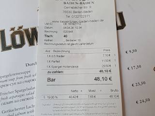 Besuch am Donnerstag, 04. April 2024 mittags Das Löwenbräu von Baden-Baden liegt zentral in der Innenstadt nahe des Leopoldplatzes. Es handelt sich um eine traditionelle Großgaststätte mit verschiedenen Stuben, zusätzlich dem Löwenbräukeller und dem prachtvollen Biergarten. Vor Ort gibt es traditionelle, gut-bürgerliche 'bayerische' Küche. Der Haupteingang zur Gaststätte liegt oberhalb im 1. OG und ist durch Treppenstufen erreichbar. Nach Eintritt wurde ich durch eine Servicekraft begrüßt und ein Tisch zur freien Auswahl in der Stube 'Pavillon' angeboten. Die Speisekarte ist vor Ort die 'Speisenzeitung', welche regelmässig überarbeitet wird, anhand der Ausgabennummer, mit Erscheinungsdatum - des Weiteren gibt es eine Aktionskarte und eine Saisonkarte. Preislich gesehen ist das Löwenbräu aus meiner persönlichen Sicht, obwohl es nun KEIN gehobenes 5* Michelin-Restaurant ist, im oberen mittleren Bereich angesiedelt, im Vergleich zu anderen gut-bürgerlichen Restaurants - allerdings liegt das Restaurant halt in der KURstadt Baden-Baden und ist für Touristen ein Anziehungsmagnet, gerade u.a. für asiatische Gäste der Kurstadt. Bestellung: > Radler 0,5l für 7,10 € > 1 Pfund (Rohgewicht) frischer Stangenspargel mit Salzkartoffeln, sowie nach Wahl: mit zerlassener Butter oder Sauce Hollandaise für 29,50 € > Schwarzwald-Parfait mit Fruchtsauce und Sahne für 11,50 € Zusammenfassung: + positiv und eher selten zu lesen *Rohgewicht* bei der Gewichtsangabe für den Spargel * grundsätzlich war der Spargel schmackhaft gut und auch von der Menge für das Geld in einem guten Verhältnis - ABER meine Sauce Hollandaise hatte wenig Geschmack, bzw. man schmeckte trotz der Sauce, den Spargelwassergeschmack heraus und durch das Wasser war die Sauce auch etwas wässrig auf dem Teller. + die verschiedenen Servicemitarbeiter waren allesamt freundlich + nach meinem Essen, wurde ich gefragt, ob es noch ein Espresso oder ähnliches sein darf ++ sehr positiv möchte ich über mein Dessert sprechen, welches geschmacklich gegenüber meinem Hauptgericht hervorgestochen ist und ich dieses empfehle :-) - die Toiletten bzw. der dortige Boden ist sichtlich etwas für die Augen :-) allerdings der Boden ist etwas klebrig gewesen (evtl. Putzmittel). Wer bayerisch-gut-bürgerliche höherpreisige Küche mag, dem kann man das Löwenbräu empfehlen. Meine persönliche Meinung ist, dass das Löwenbräu, für das was es an Speisen anbietet, preislich zu hoch angesetzt ist - allerdings Touristen hier eher weniger darauf schauen, wie die Einheimische Gäste.