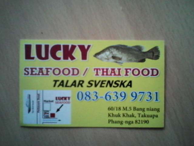 Das Lucky Seafood gibt es erst seit ca. 10 Monaten, es befindet sich wenn man von der Hauptstraße am SevenEleven abbiegt Richtung Meer auf der linken Seite, so ca. 100 - 150m. Der Inhaber ist ein Schwede( Stefan) der gut englisch spricht, seine Frau ist eine Thai, beide sind sehr freundlich und immer für ein Gespräch bereit, man wird hier sehr nett unterhalten.ü Das Essen war schnell fertig, super lecker und auch noch günstig, wir hatten 4 Getränke auch Cocktails und 3 Hauptspeisen und haben etwa knapp 12€ bezahlt. Wer es gern etwas schärfer mag, kann sich eine Auswahl an Soßen zum dippen dazu bestellen, aber Achtung!! Teilweise richtig scharf!!! Wir werden auf jeden fall wieder dort essen gehen! Thanks to Stefan!!!