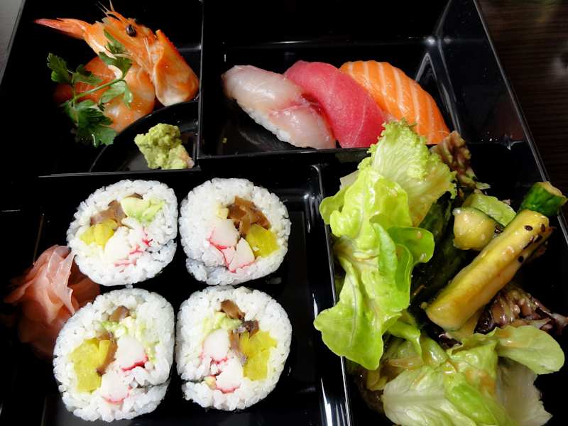 Um die Mittagszeit kehrte ich in Wien in der Börsegasse in das japanische Restaurant „Momoya“ ein und war um diese Zeit zunächst der einzige Gast. Das Restaurant ist zurückhaltend und modern eingerichtet – fliederfarbene Sessel kontrastieren mit steinernen Wänden und zurückhaltender Ethnodekoration. Der freundliche Servicemitarbeiter versorgte mich umgehend mit der Speisekarte und ich wählte das „Bento Sushi“ aus den Mittagsmenüs zum Preis von 8,90€. Inkludiert war eine Vorsuppe, die mit Tofu und Algen angenehm würzig serviert wurde. Das nachfolgende Sushi war dann ein absolutes Highlight, wurde vom Chef der Küche vor meinem Augen frisch zubereitet und bestand aus Maki mit Avocado und Lachs, feinem Lachs-Sashimi, einer großen Garnele und Nigiri-Sushi mit Thunfisch. Ein marktfrischer Salat mit Gurkenstreifen, ebenso wie Gari und Wasabi komplettierten das Bento – eine gelungene Küchenleistung! Als Dessert wurde dann noch eine interessante Scheibe einer Kokos-Panna cotta serviert und ich verließ dieses Restaurant mit dem Vorsatz, hier unbedingt noch einmal wieder einzukehren. Für das passende Wetter gibt es vor dem „Momoya“ einen kleinen Schanigarten und von der Feyung oder dem Schottenring ist man in wenigen Gehminuten vor Ort. Wer mit dem Auto kommt, kann bequem in der Tiefgarage am Concordiaplatz parken.
