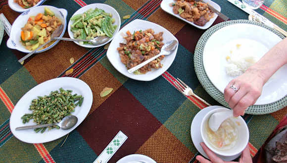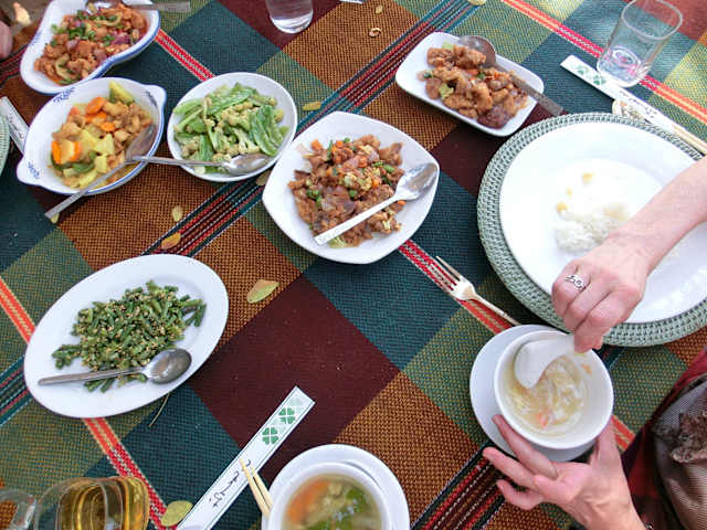 Unser Mittagessen haben wir einen Tag im River View eingenommen. Der Service war sehr freundlich und die Bedienungen flott. Für unsere Reisegruppe gab es ein Menü. Das Essen wurde mit einem kleinen Spektakel aufgetragen. Über den Steg voran gingen 2 Trommler. Dann kamen 2 Männer die auf einer Art Trage, mit Stangen auf den Schultern, das Essen transportierten. Als Vorspeise gab es eine Gemüsesuppe mit Koriander, danach Reis mit verschiedenen Sorten Gemüse, Fleisch und Fisch. Als Nachtisch gab es einen kleinen Obstteller. Alles war sehr lecker, geschmacklich pikant. Das Bier ist gut, Myanmar oder Tiger, die Flasche kostet etwa 3,50 € (0,6 l). Wir hatten einen sehr schönen Platz mit direktem Blick auf den Ayeyarwaddy.