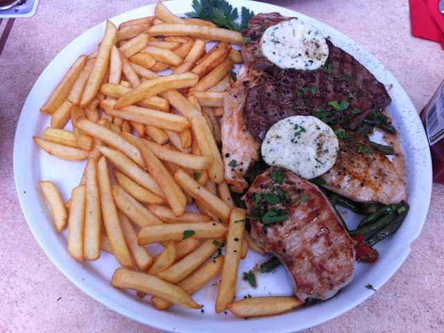 Das Restaurant befindet sich in der Fischerhüttenstraße in Zehlendorf. Das Restaurant verkauft öfters Gutscheine bei groupon oder daily deal. Ich kann die teils schlechten Bewertungen in anderen Internetportalen nicht nachvollziehen. Wir wurden sehr freundlich empfangen. Als Vorspeise gab es einen gemischten Salat mit Dressing und Weißbrot. Die Hauptspeise bestand aus zwei Sorten Fleisch (Schwein und Rind) und gegrillten Hähnchensteak. Dazu gab es reichlich Bohnengemüse und Fritten. Als Nachspeise Vanilleeis mit Himbeeren. Ich habe mich etwas für den niedrigen Preis mit dem Coupon von 13,90 Euro für zwei Personen geschämt und bei den Getränken reichlich Trinkgeld gegeben.
