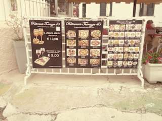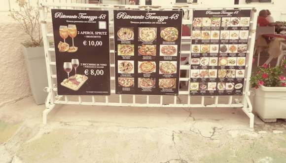 Bei unserem Stadtbummel in Toprea legten wir eine Mittagspause im Restaurant Terrazza 48 ein. Das Restaurant befand sich in der Via Liberta 40. Auf einer Werbetafel vor dem Restaurant wurden die angebotenen Speisen bildlich dargestellt und auf einer zweiten Tafel waren die Preise für die Speisegerichte des Restaurants erwähnt. Wir suchten uns einen freien Platz auf der Terrasse des Restaurants. Der Kellner brachte uns sofort die Speise und Getränkekarte. Da wir festtstellten, dass die meisten Gäste eine Pizza aßen, bestellten wir uns eine Pizza Prosciutto e Funghi.(7,00 Euro) Die Pizza Prosciutto e Funghi soll angeblich eines der beliebtesten Pizzasorten Italiens sein und ist weltweit bekannt. Als Getränk bestellten wir 2 Biere (je 0,4 l). Die 2 Gläser Bier kosteten 10,00 Euro. Der Kellner brachte uns die Getränke sofort und die Pizza in etwa 10 Minuten. Die Pizza war in Ordnung und auch über den Service konnte man sich nicht beschweren. Da es leicht regnete, hatten wir Glück, dass wir unter einen großen Schirm saßen. Wir fanden die Preise für Speisen und Getränke im Restauran Terrazza 48 ür einen Touristenort in Ordnung.