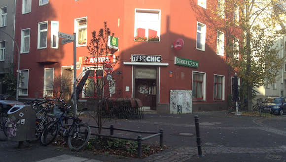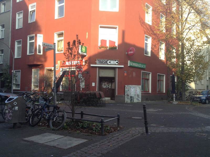 Das Kneipen- Restaurant , in dem es ausschließlich vegetarische und vegane Speisen gibt, befindet sich in Köln-Kalk in der Wiersbergstrasse 31 , Ecke Kantstrasse. Das ursprüngliche Ambiente einer Eck-Kneipe ist erhalten, das zeigt auch die Inneneinrichtung, man sitzt auf Holzbänken an derben Holztischen, in der Mitte steht ein Kickertisch, beim Tresen gibt es Spielautomaten. In der wärmeren Jahreszeit kann man draußen sitzen , ansonsten sind für die Raucher draußen direkt beim Eingang Bänke. Es gibt eine gute Auswahl an Speisen und Getränken, es ist meistens sehr voll, sodass man mit Fremden an einem Tisch sitzt, der Lärmpegel ist entsprechend hoch. Es schmeckt lecker im Trash Chic, mittlerweile ist das Lokal auch über die Stadtteilgrenze bekannt und immer gut besucht. Zum Kölner Stadtteil Kalk fährt man mit der U9 bis Kalk Kapelle , dort beginnt direkt an der U-Bahn-Station die Wiersbergstrasse , hier läuft man ca 100 m bis zur Ecke Kantstrasse .