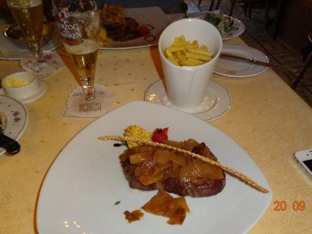 Das Lokal "Zum Erker" ist in der Treburer Stadt. Es wird Yugoslawisch geführt. Die Bedienungen sind sehr freundlich und das Lokal ist recht urig und mit massiv Holz ausgestattet. Die Karte ist sehr klein. KAum auswahl. Steaks, Schnitzel, Leber und Wild wird angeboten. Für mein geschmack zu wenig Auswahl. Wir waren hier mit 8 Personen und da wird es mit der Auswahl knapp. Ein Rumpsteak geht immer, aber das war geschmacklich nicht ganz so toll, ich fand es überwürszt, so dass ich das Rind nicht mehr geschmekckt habe. Unsere Frauen waren vom Wild begeistert, aber sagten, das nur Felisch und Klöse zu wenig waren, da kein Gemüse serviert wurde. Ich kann nur sgaen, dass das Lokal OK ist, ich aber persönlich nicht ein zwetes mal da rein gehen würde, weil ich nicht wüsste was ich bestellen soll. Ich mag keine Schnitzel und die Steaks waren nicht besonders. Da gibt es in Rüsslesheim besseres. Nett fanden wir noch, dass das Wild am Tisch auf den Teller serviert wurde und es sogar noch einen NAchschlag gab.