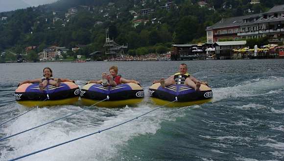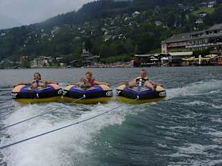 Ein Riesenspass - Bis zu 4 Personen werden, auf jeweils einem großen Plstikreifen sitzend, von einem Motorboot über den See gezogen. Je nach Geschwindigkeit hebt man durch die Wellen des Bootes schon mal kräftig ab (.... und geht dann u. U. baden, mit Schwimmweste). Man wird wieder eingesammelt, und weiter geht ´s. Der Ritt dauert gut 10 Minuten und kostet ca. 8 Euro. Wasserscheue Begleiter (z. B. Eltern) können, je nach Platzverfügbarkeit, im Boot kostenfrei mitfahren und tolle Fotos schießen. Für Kinder und Erwachsenen ein tolles Vergnügen. Sollte man sich nicht entgehen lassen Lagebeschreibung: Wassersport Strobl an der Uferpromenade Millstatt, links vom Strandbad