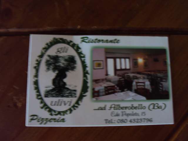 Das Ristorante Gli Ulivi liegt etwas außerhalb des touristischen Kerns von Alberobello (am Sportplatz). Wir hatten uns daraufhin etwas in der Art von einem deutschen Vereinslokal vorgestellt und waren äußerst positiv überrascht schon vom ersten Eindruck: ein toller Garten, durch Bäume und Büsche völlig abgeschirmt mit einer ganz eigenen romantischen Atmosphäre. Der Wirt scheint Deutsch zu sprechen, die Speisekarte ist mittlerweile auch mit englischen und deutschen Übersetzungen versehen. Sehr breites Angebot an klassischen italienischen und vor allem an apulischen Spezialitäten. Unser Tipp: die "Antipasti della casa" (für 13,50) bestellen, aber nur eine Portion für 2 Leute! Selbst so ist man danach eigentlich schon satt, es kommen zwischen 12 und 15 verschiedene Leckereien auf kleinen Tellern und Schüsseln. Danach kann man eigentlich nur noch einen Primo Piatto oder einen Secondo Piatto schaffen; es gibt aber auch sehr gute Pizza. 'Wie überall in Italien ist das Wasser sehr günstig, aber auch die Weine sind äußerst preiswert: wir haben z.B. einen sehr guten Primitivo für 8,90 die Flasche getrunken. Der Café am Ende ging aufs Haus. Unbedingt reservieren, am besten vom Hotel aus anrufen lassen! Der Laden ist immer voll.