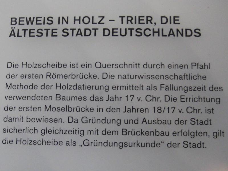 Die Römerbrücke erreicht man zu Fuß am ehesten, wenn man die Fleischstraße (Fußgängerzone) Richtung Süden nimmt, weiter die gegenüberliegende Brückenstraße und letztendlich nach einer Kreuzung weiter südlich auf der Karl-Marx-Straße geht. Am Ende dieser Straße ist man dann an der Mosel und der Römerbrücke. Abgesehen davon, dass man hier auch einen prima Spaziergang entlang der Mosel machen kann: Die Brücke und auch ihre Geschichte haben mir sehr gut gefallen. Dazu Einzelheiten: Im Rheinischen Landesmuseum entdeckte ich eine Holzscheibe von 17 v. Chr., die aus einem Querschnitt durch einen Pfahl der ersten Römerbrücke stammt. Von dieser ersten Brücke sind nur wenige Holzpfähle erhalten geblieben. Im 1. und 2. Jh. wurde dann umgebaut, verstärkt, und die mächtigen alten Pfahlstellungen, auf denen das Fundament der heutigen (neuen) Brücke steht, sollen von ca. 71 stammen. Diese habe ich nicht gesehen, denn man sieht sie nur bei niedrigem Wasserstand der Mosel, und damit ist im Februar nicht zu rechnen. Aber ich weiß, dass es sie gibt… Was die Brückenbögen betrifft: Steinerne Brückenbögen gab es erst ab dem 14. Jh. Da bei meinem Besuch ausnahmsweise mal die Sonne schien, präsentierten sich Brücke und Mosel von einer wirklich schönen Seite. Somit habe ich noch einen kleinen Spaziergang entlang der Mosel Richtung Süden gemacht. Hat mir alles insgesamt wirklich gut gefallen. Neben dem Brückenkopf zur Stadtseite findet man übrigens einen Pfeiler mit einem Standbild Konstantins I. - ob neueren oder älteren Datums, konnte ich leider nicht in Erfahrung bringen.