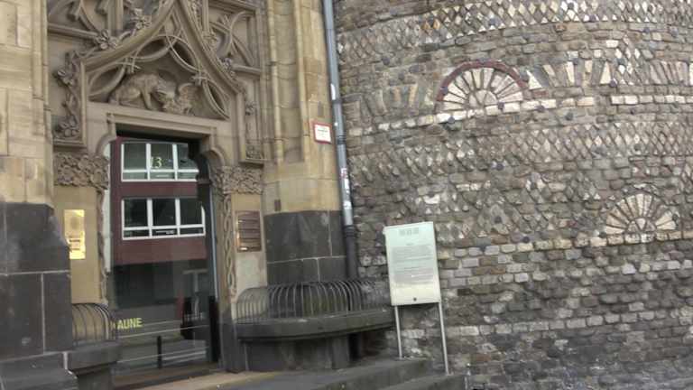 Der "Römerturm", der letzte erhaltene Wachturm der damaligen fast vier Kilometer langen römischen Stadtmauer, befindet sich an der Kreuzung Sankt-Apern-/Zeughausstraße in der Kölner Altstadt-Nord. Der Turm wurde um 50 n.Chr. errichtet und über die Jahrhunderte als Teil des Klarissenklosters St. Clara und als Latrine genutzt. Nach der Säkularisation wurde der Römerturm aufgestockt und diente zwischenzeitlich zu Wohnzwecken. Seit 1984 beherbergt er eine Kunstgalerie. Auffallend ist das mit Natursteinmosaiken verzierte Äußere des Turms. Der Turm ist denkmalgeschützt. Homepage: https://www.koelntourismus.de/kunst-kultur/sehenswuerdigkeiten/detail/roemerturm