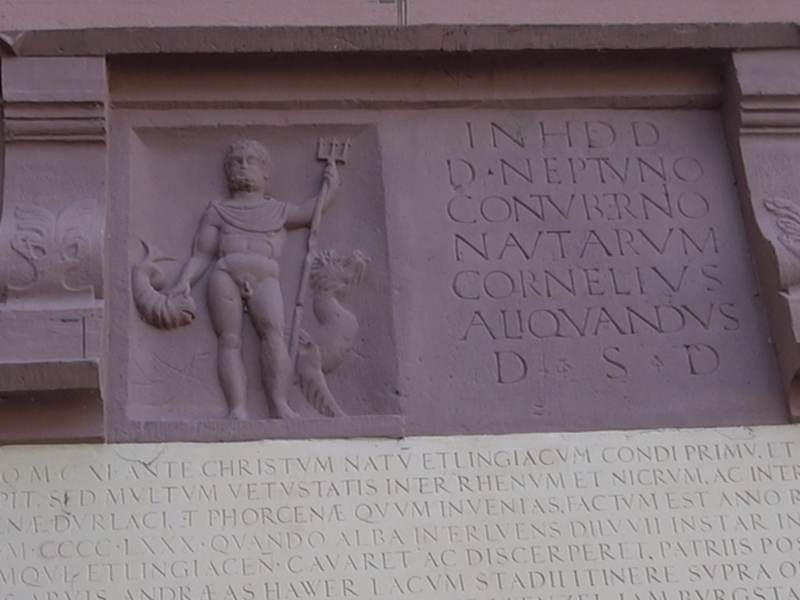 Der römische Neptunstein aus dem 3. Jahrhundert n. Chr. befindet sich an der Rathauswand. Er ist Station Nr. 26, Teil des Historischen Rundgangs durch Ettlingen. Sein Fund 1480 hat die Fantasie der Humanisten angeregt: Caspar Hedio verfasste daraufhin 1554 die lateinische Inschrift. Der Text lautet: "Zu Ehren des Kaiserlichen Hauses weiht diesen Stein dem Gott Neptun namens der Schifferstadt Cornelius Aliquandus aus eigenen Mitteln". Adresse: Marktstraße, 76275 Ettlingen Webseite: https://de.m.wikipedia.org/wiki/Datei:Ettlingen_Neptunstein.jpg Geodaten: WCR5+J4 Ettlingen