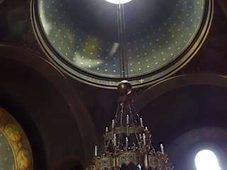 wir hatten Glück, die Kirche war geöffnet, wir konnten mit vielen russisch orthodoxen Gläubigen, rein schauen, aussen goldener Zwiebelturm, innen bemalte Ikonen und Ikonostas, man konnte auch Kerzen anzünden. Sehr innige friedliche Atmosphäre