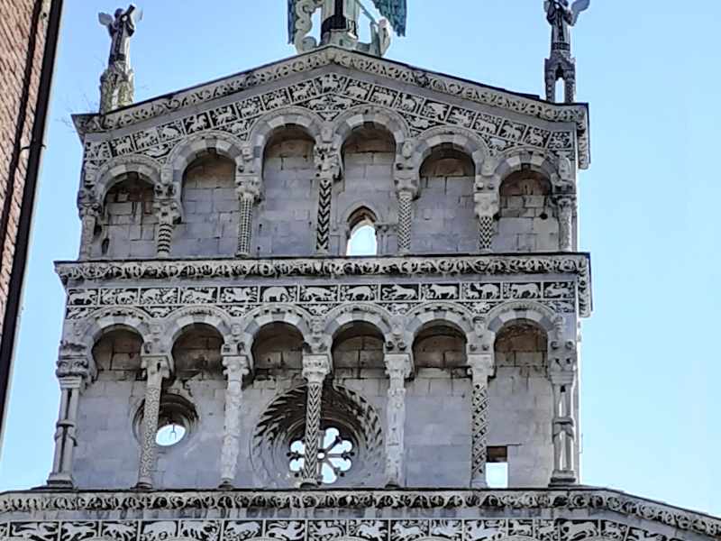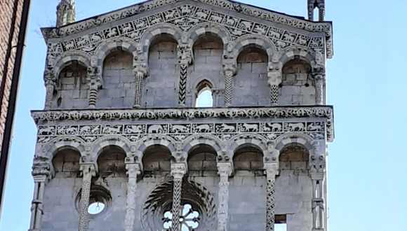 Hoch oben auf der Spitze der beeindruckenden Fassade sieht man eine Statue des Erzengels Michael. Am Standort der Kirche im Zentrum von Lucca befand sich einst das römische Forum. Die Kirche hatte bis ins 14. Jahrhundert auch besondere politische Bedeutung, weil hier der Große Rat tagte, der das höchste gesetzgebende Organ von Lucca war.