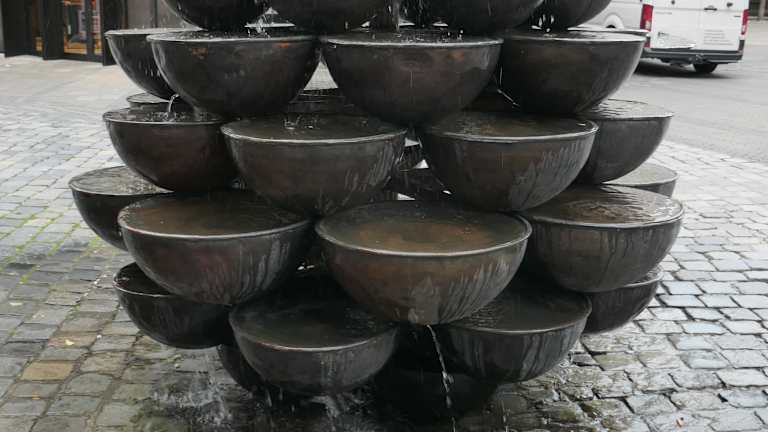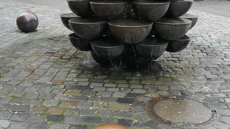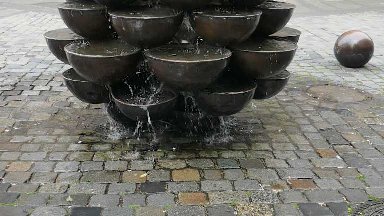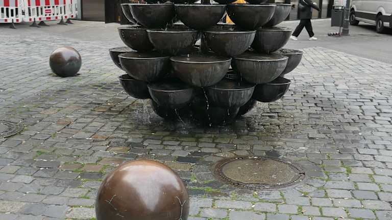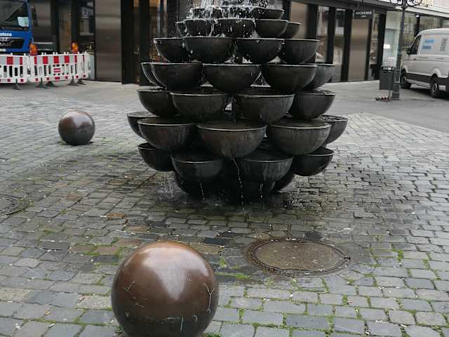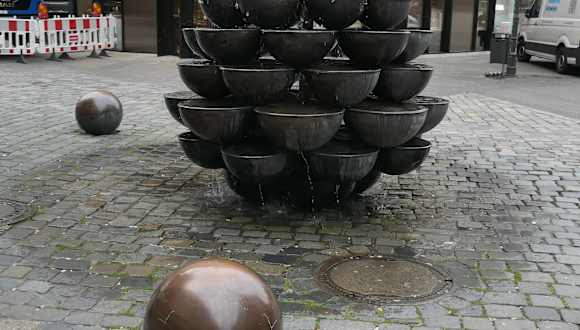 In Nürnberg findet man in der Lorenzer Altstadt in der Kaiserstraße an der Ecke zur Fleischbrücke den sogenannten „Schalen-Kaskaden-Brunnen“, der auch als Schüsselbrunnen bezeichnet wird. Der Brunnen stammt aus dem Jahr 1977 und besteht aus 60 kupfernen Schalen. Gekrönt wird der Schalen-Kaskaden-Brunnen von einer Kugel, aus der das Wasser kommt, welches sich in die Schalen ergießt und sich über die Schalen hinweg den Weg nach unten sucht. Umgeben ist der Schalen-Kaskaden-Brunnen von fünf oder sechs Bronzekugeln, die vor dem Brunnen verteilt sind. Irgendwie erinnert dieser Brunnen an einen übergroßen Pinienzapfen.