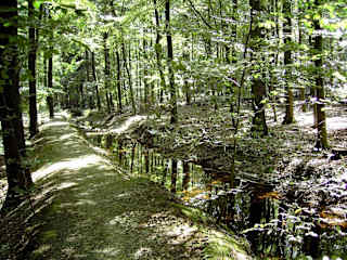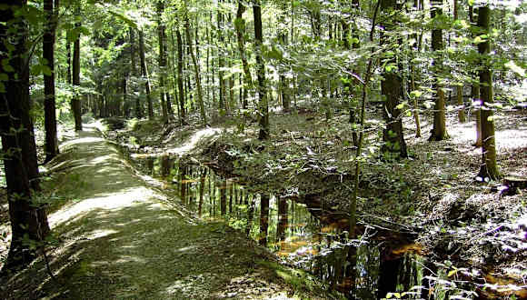 Wer in der Schule gelernt hat, dass Wasser immer ins oder im Tal strömt, muss seine Meinung (teilweise) revidieren. Im Naturpark „Hohes Venn-Eifel“ kann man östlich der Gemeinde Roetgen erleben, dass ein Bach auch oben am Hang fließen kann. Zwecks der Trinkwasserversorgung hat man in den Jahren 1920-1921 zwei künstliche Gewässer angelegt – die Hanggräben „Schleebachgraben“ (3,2 km) und „Hasselbachgraben“ (7,9 km) –, die das Oberflächenwasser aus dem Staatsforst Monschau abfangen und der Dreilägerbachtalsperre zuleiten. (Trinkwasserversorgung des Aachener Raumes) Die beiden Hanggräben liegen mitten im Naturpark und deren Ufer lassen sich ganz leicht bewandern. Vor allem im Sommer ist es hier besonders angenehm ; schattiger Wald und herrliche Abkühlung durch die Gräben. Verschiedene Wanderwege führen kilometerlang an diesen Gewässern entlang ; die Höhenunterschiede sind gering. Guter Ausgangspunkt ist der Wanderparkplatz „Kuhberg“ am östlichen Dorfrand Roetgens (Markierungen A2, A3). Empfehlenswerte Wanderkarte : Die Karte Nr. 3 des Eifelvereins, „Monschauer Land – Rurseengebiet“ (1:25000).