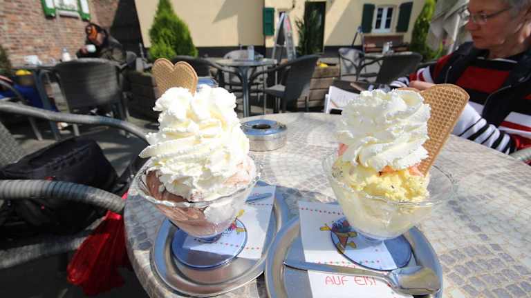 Ich habe für diesen Bericht die eigene Werbeaussage des Schloß Cafés in Zons (Zons gehört zur Gemeinde Dormagen) vorangestellt, weil das rundum das Italienische Eiscafe - Konditorei - und Lounge Bar am besten beschreibt. Wir waren im April 2014 in Zons bummeln, haben an einer privaten Führung teilgenommen und sind dann im Schloss Café eingekehrt. Einige in unserer Gruppe orderten Kaffee und Kuchen des Hauses. Uns reizte die bunte Eiskarte, und so bestellten wir Erdbeereisbecher und Joghurette Becher. Dabei studierten wir auch die kleine Snack Karte. Hier kann man frühstücken, mittags einen Snack bestellen und zur Kaffeezeit leckeren Kuchen genießen. Freundlicher Service und gute Qualität – das führt zur Aussage „Geniessen im Herzen von Zons“. Zurück ging es dann mit der Fähre Zons-Urdenbach über den Rhein, die im Sommer bis 21 Uhr fährt. Unser Tipp: Gegenüber vom Café - gleich links vom Museum, können Sie durch das Tor auf das historische Gelände gelangen, wo einst der Erzbischof von Köln wohnte. Und wenn Sie dann bei Ihrem Rundgang Kaffeedurst bekommen haben, können Sie den bei schöner Witterung sogar draußen unter den Bäumen am Schlosscafe stillen (Schlossplatz 4, 41541 Dormagen – Ortsteil Zons, Tel: 02133-5437) .