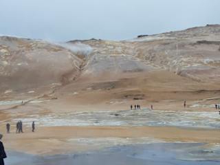 Die Schwefelquellen liegen nordöstlich des Myvatn-Sees. Unzählige Schlammtümpel köcheln dort vor sich hin, einige kochen ungestüm über und verspritzen schlammige Brühe in die Umgebung. Auch zischt, brodelt, gurgelt und dampft es überall, das alles ist wirklich sehr interessant zu beobachten. Es riecht nach verfaulten Eiern, aber mit dem Wissen darum und der entsprechenden Einstellung dazu, kann man diesen Geruch durchaus auch für längere Zeit ertragen. Schwefel und andere Mineralien verwandeln das Gebiet in eine gelb, rot und weiß gefärbte Landschaft. Irgendwie fühlten wir uns in eine völlig fremde Welt versetzt. Die Vielfältigkeit der unterschiedlichen Aktivitäten der Schwefelquellen und Schlammtümpel läßt den Besuch dieser Stätte sehr kurzweilig erscheinen. Um Unfälle zu vermeiden, wurden entsprechende Schilder und Begrenzungen aufgestellt.