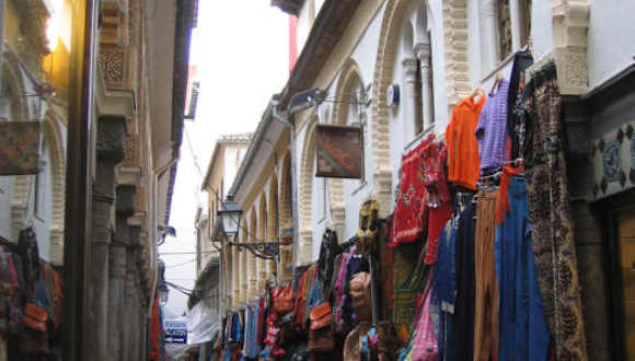 Im südspanischen Granada ist der arabische Einfluss bis heute nachhaltig präsent. Sinnbild für die arabische Kultur ist der bunte arabische Markt, der sich durch mehrere Straßen erstreckt. In der Gasse La Alcaicería, nicht weit entfernt von der Kathedrale, war früher der arabische Seidenmarkt angesiedelt. Der Markt wurde abends rundherum durch neun Tore verriegelt und mit Eisenketten verschlossen. Wachen liefen nachts mit Hunden durch die Gassen, um die wertvolle Ware zu schützen. 1843 brannte der Markt nieder und wurde anschließend teilweise wieder rekonstruiert. Allerdings konnte er seine große Bedeutung nie wieder erlangen. Heute werden in den kleinen Geschäften vor allem touristische Souvenirs und Kunsthandwerksartikel aus Keramik, Holz, Glas und Silber verkauft.
