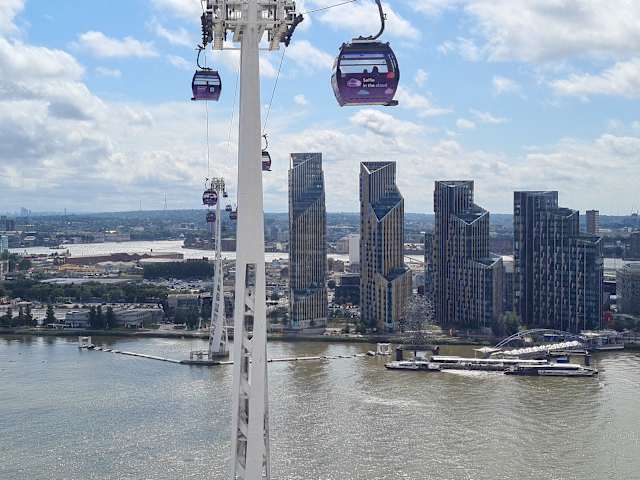 Von den Londoner Docklands ( DLR Station Royal Victoria ) zur Greenwich Peninsula in einer Gondel 90 Meter hoch über die Themse zu schweben war bei unserem Londonbesuch ein besonderes Highlight. Bei wunderschönem Wetter hatten wir einen sensationellen Blick auf die Olympiaanlagen und das moderne London mit seinen Hochhäusern.