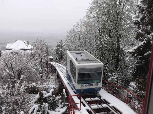 Die kurze Fahrt mit der Seilbahn ist nett, aber nicht wirklich eindrucksvoll. Oben angekommen sieht man zuerst mal gar nicht auf Zürich hinunter. Möglicherweise hat man im Spätherbst/Winter einen schönen Ausblick. Im Sommer verdecken die Bäume die Sicht. Man muss schon eine Weile steil bergauf marschieren, bis man einen klitzekleinen Blick auf Stadt und See erhascht. Wir sind so zwar zu einem sportlichen Ausflug in gesunder Luft gekommen aber alles in allem war es zu viel Zeitaufwand für wenig Ergebnis.