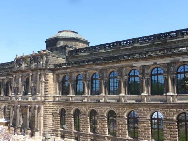 Gottfried Semper errichtete von 1847 bis 54 diesen Museumsbau im Stil der italienischen Hochrenaissance im Zentrum von Dresden. Er ist denkmalgeschützt, in ihm ist die Gemäldegalerie ALTE MEISTER untergebracht. Semper erhielt den Auftrag im Jahre 1838 von König Friedr. Aug. II. Da er aber am Maiaufstand 1849 beteiligt war, mußte er aus Sachsen fliehen, da war der Bau schon bis zum Erdgeschoß fertig. 2 Schüler von ihm übernahmen den weiteren Bau, wobei der Bildhauer Ernst Rietschel die Fassadenentwürfe fertigte, Semper aber darauf Einfluß nahm. Seit 2013 wird das Gebäude erneuert. Der Ostflügel ist praktisch 2017 fertig geworden, sodaß die wichtigsten Bilder darin gehängt werden konnten. Der Westflügel ist jetzt in Arbeit. Durch das undichte Dach drang Wasser ins Mauerwerk, das von Schimmel befallen ist, es muß gänzlich erneuert werden, Voraussichtlich reichen die geplanten 50 Mio. Euro nicht aus. Bei unserem Besuch konnten wir nur im Ostflügel die Bilder anschauen, aber die wirklichen Sensationen wie die Sixt. Madonna ; das Wiener Schokoladenmädchen, auch verschiedene Canaletto-Veduten aus Dresden und Venedig waren dort zu sehen. Der Semperbau ist Teil des Zwingers, er hat eine Fassade zum Innenhof und zum Theaterplatz, wer den Zwinger besucht, kann Aussen und Innen völlig kostenfrei aufsuchen, für Gäste die nur am Zwinger interessiert sind um Fotos zu machen, ganz herrlich. Nicht jeder hat Interesse an den Alten Meistern. Auch die Orangenbäumchen sind wieder dort.