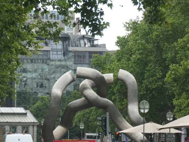 Die "Skulptur Berlin" steht zwischen der Nürnberger und der Marburger Straße auf dem Mittelstreifen der Tauentzienstraße. Die etwa acht Meter hohe Plastik wurde von dem Künstlerpaar Brigitte und Martin Matschinsky-Denninghoff aus Chromnickelstahl geschaffen und 1987 an ihrem heutigen Standort am Europa-Center installiert. Die ineinander verschlungenen, aber getrennt aufgestellten Röhren stellen die Situation des geteilten Berlins dar. Mit der Kaiser-Wilhelm-Gedächtniskirche im Hintergrund ist die Skulptur eines der beliebtesten Fotomotive Berlins. Homepage: https://www.berlin.de/ba-charlottenburg-wilmersdorf/ueber-den-bezirk/kultur-und-wissenschaft/skulpturen-und-denkmale/artikel.111026.php