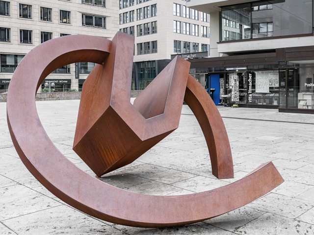 Auf dem Kleinen Schlossplatz steht eine interessante Skulptur. Sie zeigt einen Ring aus Corton Stahl 200 x 270 x 300 cm. Im Ring ist ein auf den Kopf gestelltes Haus zu sehen. Sie ist von Werner Pokorny 1990 hergestellt. Der Name ist Haus, drehend. Sie soll Ruhe und Bewegung als Gleichgewicht ausdrücken. Aber auch Yin und Yang, die Anspannung und Entspannung. Adresse: Kleiner Schloßplatz, 70173 Stuttgart Webseite: https://welt - der - form.net/Stuttgart/Pokorny - 1990 - Haus_drehend - Tante_Hossi_01.html Geodaten: Q5HG+8P Stuttgart