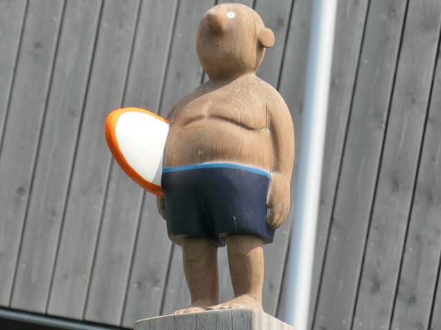 Die Holzskulptur „Mann am Kliff“, die sich in Sahlenburg am Aufgang zum Restaurant befindet, stellt einen kleinen, dicklichen Mann dar. Er hat nur eine Badehose an. Unter dem Arm hat er ein Surfbrett. Sein Blick geht hinaus auf die Nordsee (anscheinend ist Ebbe und er sucht entsetzt das Wasser zum Surfen).