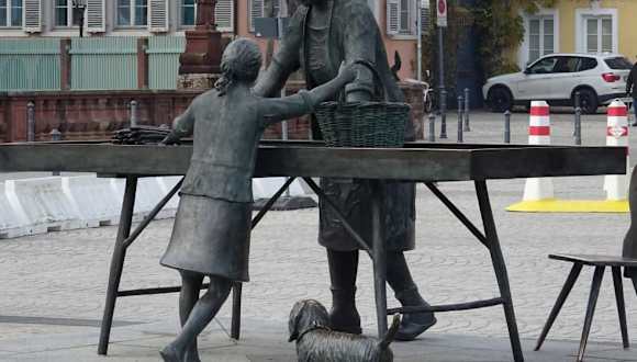 Direkt vor der Brauerei zum Ritter steht eine Bronze als Andenken zur badischen Spargelfrau. Es zeigt einen Verkaufsstand mit Spargen und die Verkäuferin. Gross. Mehrere Spargen aufgestappelt, wirkt so echt, als würde man morgen früh dort Spargel kaufen gehen.