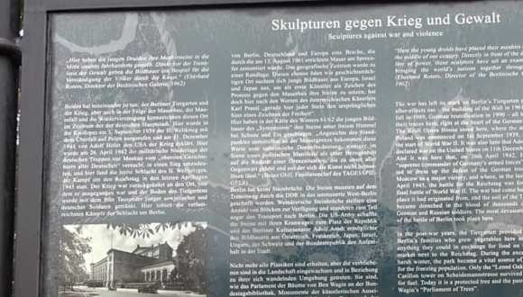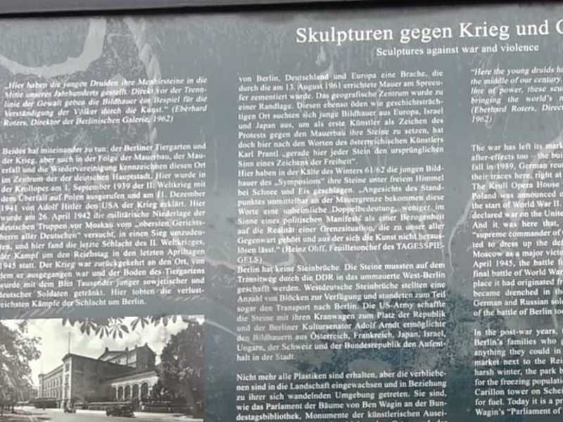 Einst stand hier die Krolloper, ein Haus der Nationalsozialisten. 1951 wurde es gesprengt. 1961/1962 setzten junge Künstler aus Europa, Israel und Japan Zeichen gegen Krieg und den Mauerbau. Die Bildhauer schufen damals rund 20 Plastiken, als Zeichen des Protests gegen die Errichtung der Berliner Mauer. Die Skulpturen befinden sich im Berliner Regierungsviertel, gegenüber dem Reichstag. Am Ausstellungsort findet sich eine Informationstafel.