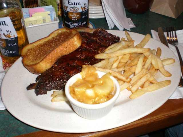 Die Baby-Back Ribs muß man einfach probiert haben. Auch wenn der Andrang recht groß ist, bekommt man relativ schnell einen Platz (wir haben nie länger als 20 Min. gewartet). Die Zeit läßt sich prima an der Bar überbrücken. Die Kinder sind begeistert, denn überall hängen Fernseher an den Wänden und zu malen gibt es natürlich auch was. Ganz unbedingt sollte man die Strawberry Lemonade probieren. Die ist so lecker, daß sie fast das Essen ersetzt! Aber am allertollsten sind die Baby back ribs. Nicht vergessen die Barbecue Sauce dazu! Und natürlich die obligatorischen Baked Beans und Cole Slaw. Das ist das perfekte Essen. Immer wenn wir in Orlando sind gehen wir sofort zu Smokey Bones!!!