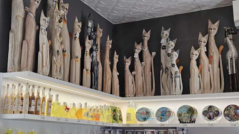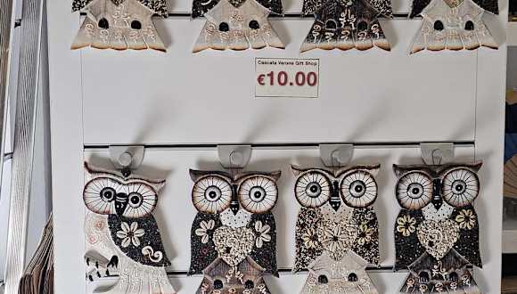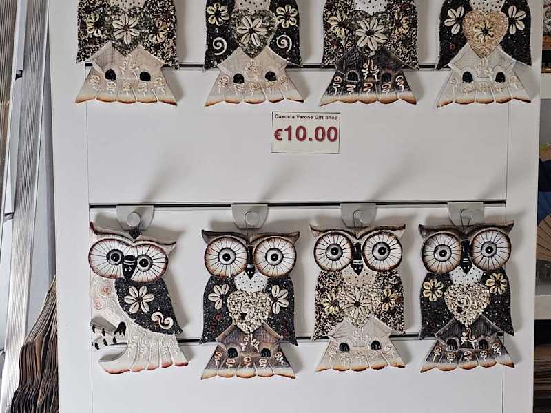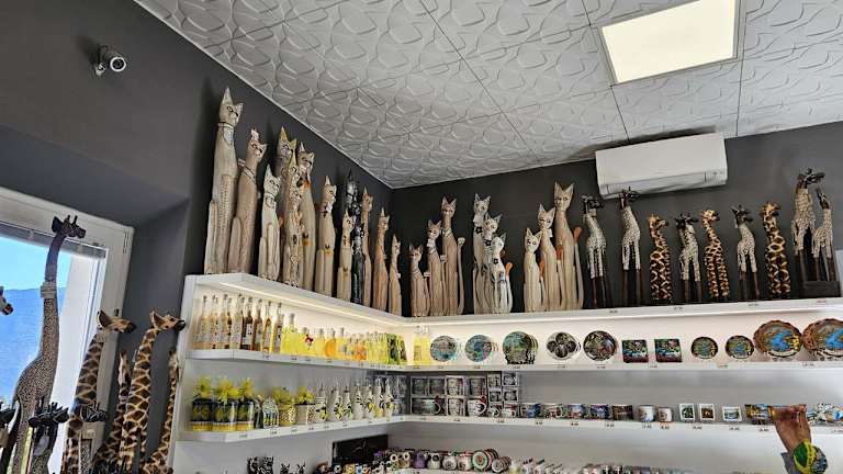Direkt am Eingang und vor der Kasse gibt es noch einen Souvenirshop. Hier kann man Reiseandenken erwerben. Katzen, Elefanten, Uhus und vor allem Schildkröten in allen Größen und Farben gibt es zu kaufen. Natürlich auch Mützen und sogar Fächer gegen die Hitze. Adresse: Località Le Foci, 3, 38060 Tenno TN, Italien