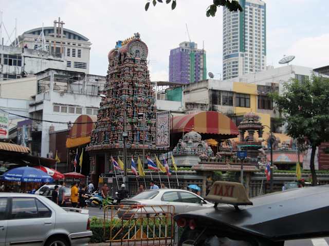 Wer nach soviel Tempel mit Buddhas eine Abwechslung haben möchte sollte sich diesen Hindutempel ansehen. Ein sehr bunter farbenfroher Tempel mit einem reich verzierten Eingangstor (Gopuram) der von vielen Indern frequentiert wird. Man kann das Innere des Temples betreten, vorher die Schuhe ausziehen. Im Tempel darf man nicht fotografieren. Der Hauptschrein ist der Gattin Shivas gewidmet sowie ihren 2 Söhnen einer davon ist Ganesha mit dem Elefantenkopf. Als wir schon in der Nähe des Temples waren und nur mal kurz auf unseren Stadtplan geblickt hatten, war gleich eine sehr freundliche Thailänderin da die uns weiter helfen wollte. Als sie hörte das wir den Hindutempel besuchen wollten sagte sie uns er wäre geschlossen. Zum Glück kannten wir diesen Trick schon aus den Reisebüchern. Solche Hinweise der Thailänder sollte man immer ignorieren.