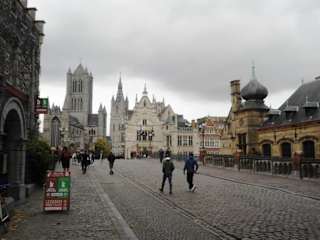 Wenn man über die Michaelsbrücke in die Altstadt von Gent geht, hat man links am Ufer der Schelde entlang der Gras- und Korenlei die schönen Zunft- und Speicherhäuser des alten Hafens und geradeaus ein ganz besonderes Panoramabild der Altstadt: Hintereinander aufgereiht sind der Turm der St. Nikolaus-Kirche, der Belfried und der Turm der St. Bavo-Kathedrale. Nur von dieser Brücke aus kann man diese berühmte Genter Turmreihe vollständig sehen.