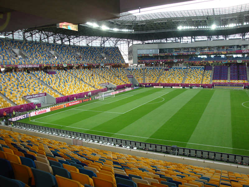 Das neue Schmuckkästchen von Lwiw hat ca. 35.000 Plätze. Für das EM-Spiel Portugal : Dänemark wurden 30.000 Zuschauer von der UEFA zugelassen. Das Stadion war ausverkauft. Die Stimmung herrlich. Alles brandneu. ca. 12 km außerhalb der Innenstadt. Dadurch das keine Laufbahn zwischen dem Spielfeld und den Tribühnen ist, sitzt man sehr nahe am Geschen. Nach der EM wird vermutlich der lokale Verein Karpaty Lwiw hier seine Heimspiele austragen.