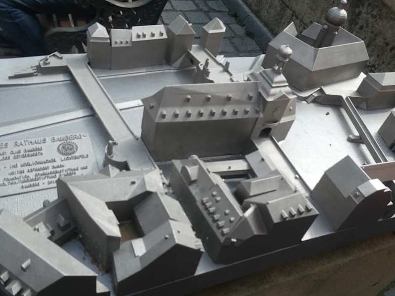 Vor dem Alten Rathaus von Bamberg befindet sich seit Mitte 2019 am Abgang der Oberen Brücke (vom Alten Rathaus aus Richtung Karolinenstraße / Domberg) ein Stadtmodell, das aus einem Metall-3D-Drucker entstanden ist. Genauer gesagt ist es kein Stadtmodell, sondern ein Modell vom Alten Rathaus mit der Oberen Brücke, der Unteren Brücke, dem linken Regnitz-Arm und einigen Gebäuden, die in unmittelbarer Nähe zum Alten Rathaus stehen. Man bekommt anhand dieses Modells einen guten Überblick über das Gebiet. Wenn man an der Oberen Brücke und am Alten Rathaus ist, so sollte man durchaus den einen oder anderen Blick auf dieses Modell vor dem Alten Rathaus werfen. Besonders empfehlenswert ist es für Menschen mit Sehbehinderungen.