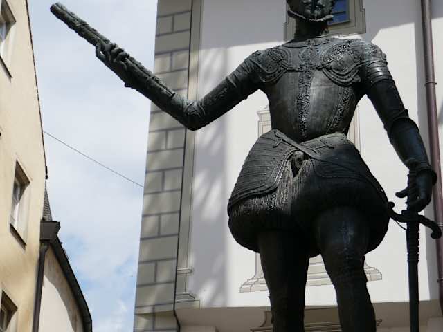 Kaiser Karl V. logierte 1541 während des Reichstags in der Heberge / Gasthof Goldenes Kreuz. Er verbrachte eine Nacht mit der stadtbekannten Schönheit Barbara Blomberg, Tochter eines Handwerkers aus Regensburg. Dieses Ereignis hatte dann zwei Erfolge, die Dame brachte nach einem Jahr einen Sohn zur Welt. Der Sohn wurde im Alter von 3 Jahren von der Mutter getrennt und nach Spanien verbracht. Er wurde dort entsprechend erzogen, erlernte ntürlich die deutsche Sprache, spanisch, latein und ging zur Marine. Als Erwachsener nannte man ihn Don Juan d`Austria. Im Jahr 1571 war er Oberkommandierender der " Heiligen Liga ". In Lepanto ( man sagt Griechenland) errang er mit seiner Flotte einen grandiosen Sieg über die Türken. Viele sagten er war der Retter des Abendlandes. Wer eine Nachbildung seines tollen Schiffes sehen will, in Barcelona im Marinemuseum steht dieses Schiff, oder meine Bewertung von Barcelona, Marinemuseum. Don Juan de Austria verstarb unter nicht geklärten Umständen, manche sagen unter Gift. Das Denkmal in Regensburg steht auf dem kleinen Platz am Alten Museum.